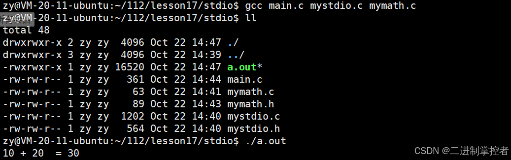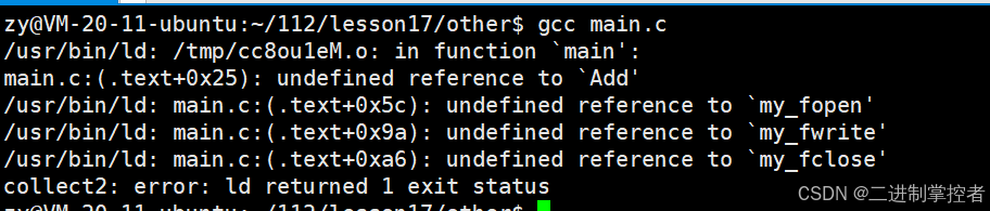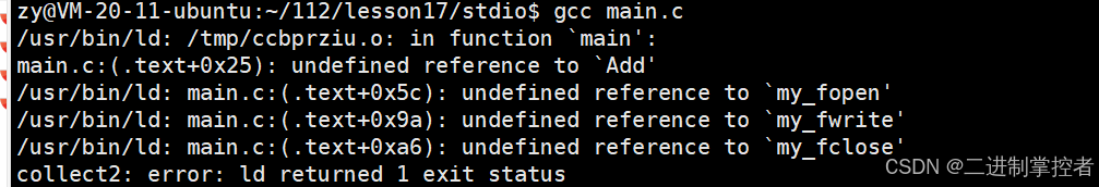 gcc main.c 只编译了main.c文件,并没有包含对mymath.o 和 mystdio.h 的链接操作,因为main.c 依赖于mymath.h 和 mystdio.h 中声明的函数,因此仅编译main.c是不够的。