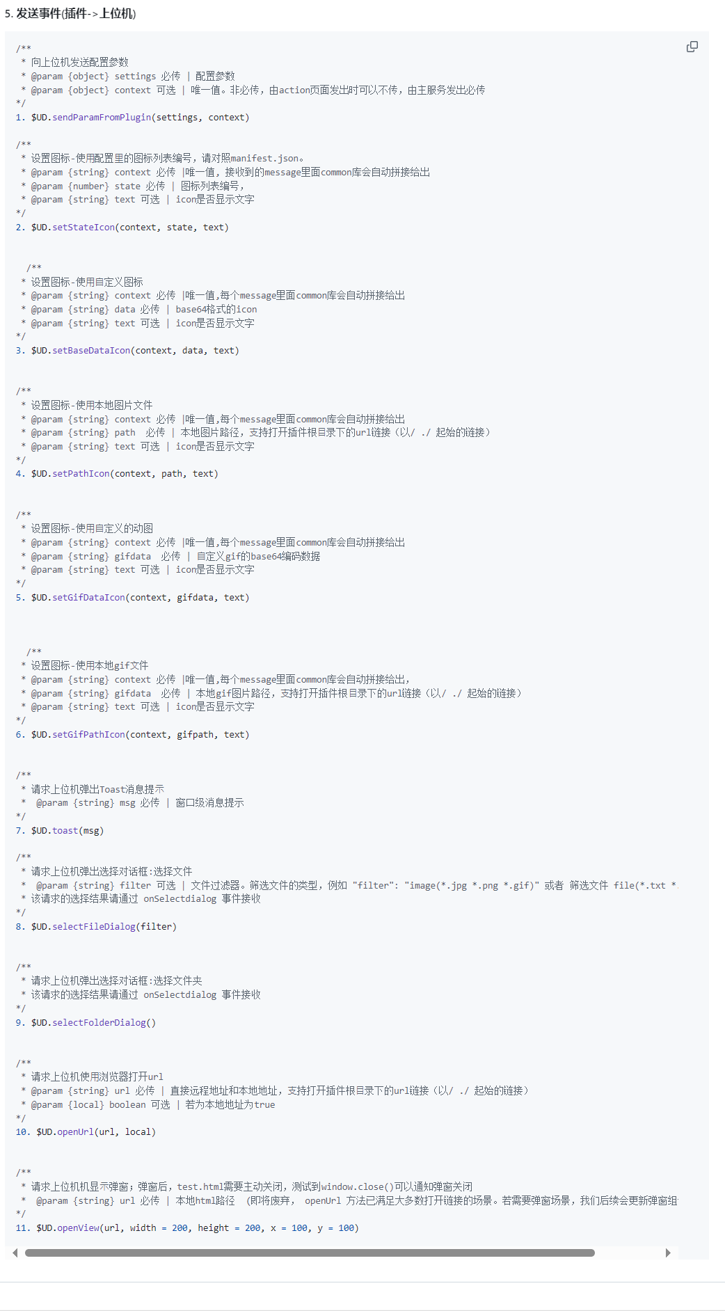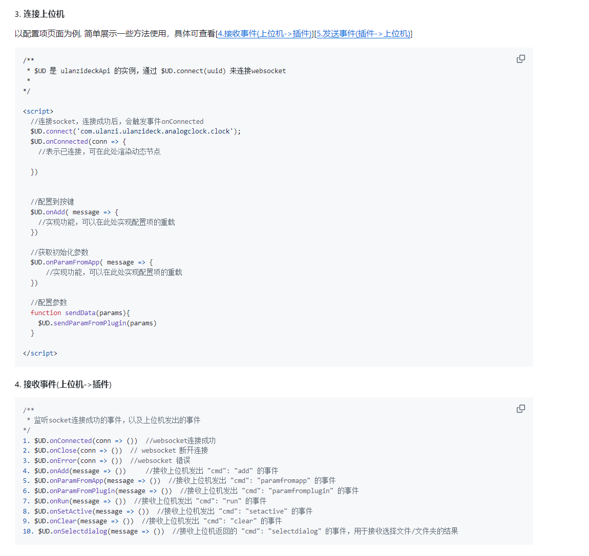 &key="0_0" //Action在当前页的坐标,在5*3方格区域里13个可设置区域,左上是0_0,任意位置为“行_列”以UlanziDeck Plugin SDK中为例,可以看到,在实现插件 app.html/js 和 propertyInspector.html时,应当首先与服务端建立连接: $UD.connect(UUID) ,随后通过监听服务端传来的事件,完成插件的功能。