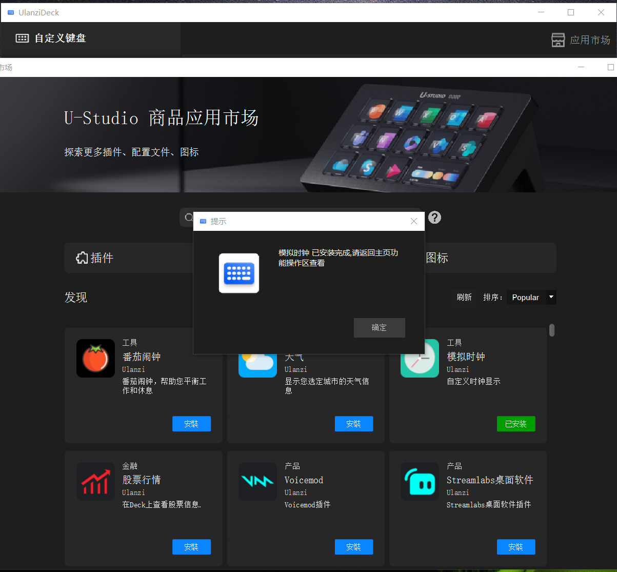 下载完UlanziDeck软件后,打开右上角应用市场,下载模拟时钟,让我们看看模拟时钟的效果
