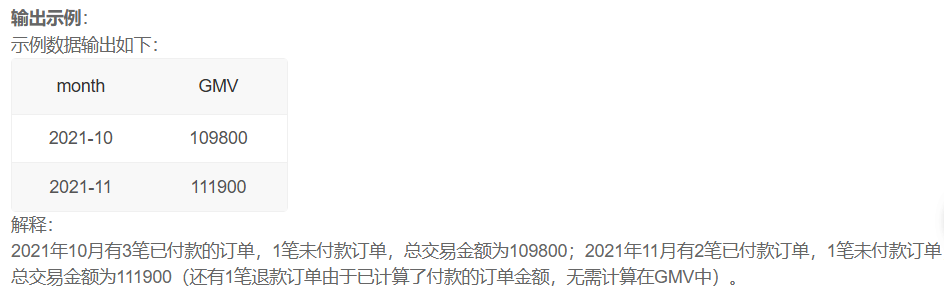 问题:请计算商城中2021年每月的GMV,输出GMV大于10w的每月GMV,值保留到整数。