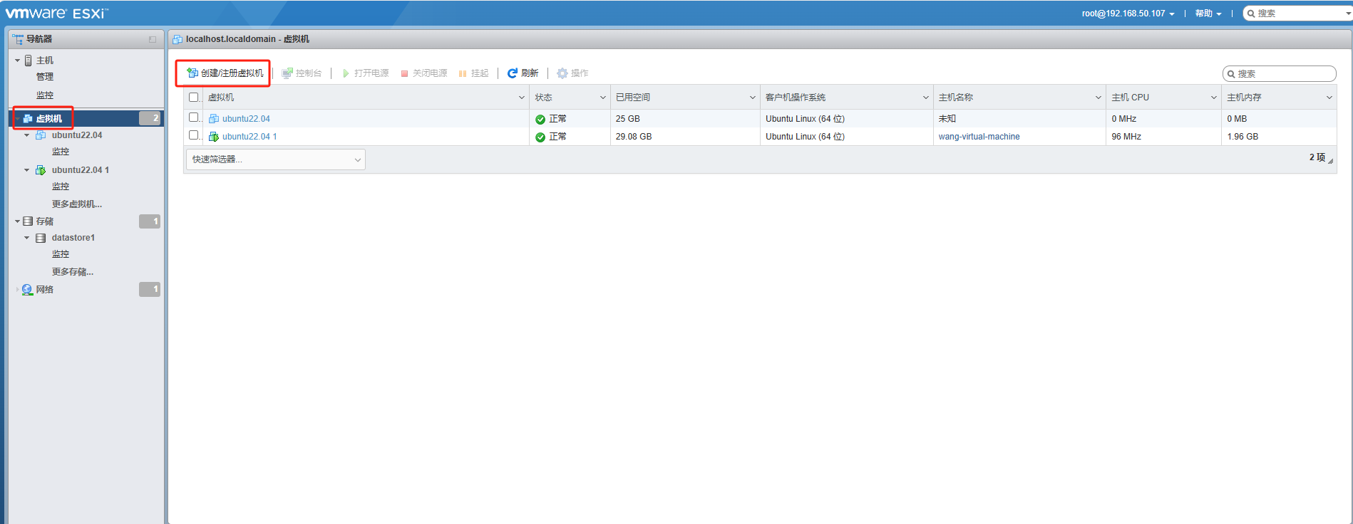 首先进入到VMware ESXI中,点击左侧虚拟机,点击上方 创建/注册虚拟机