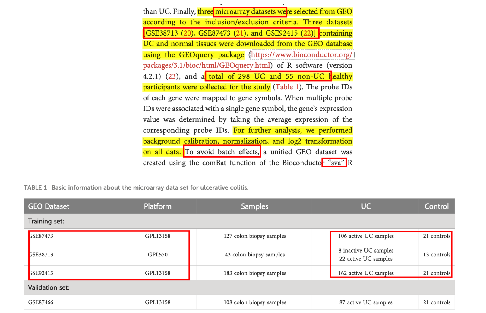 可以看出这是一篇纯生信的文章,前期还是常规的GEO数据挖掘,取了三个与UC相关的数据集,处理后合并在一起,去除批次后,进行常规的差异基因和富集分析,之后与铜死亡相关基因取交集,取交集基因进行机器学习建模和亚群分类等。这篇文档主要介绍数据收集和预处理,差异表达基因鉴定,以及给大家复现一下原文章的Fig 2.A,后续的复现等之后再给大家一一复现。