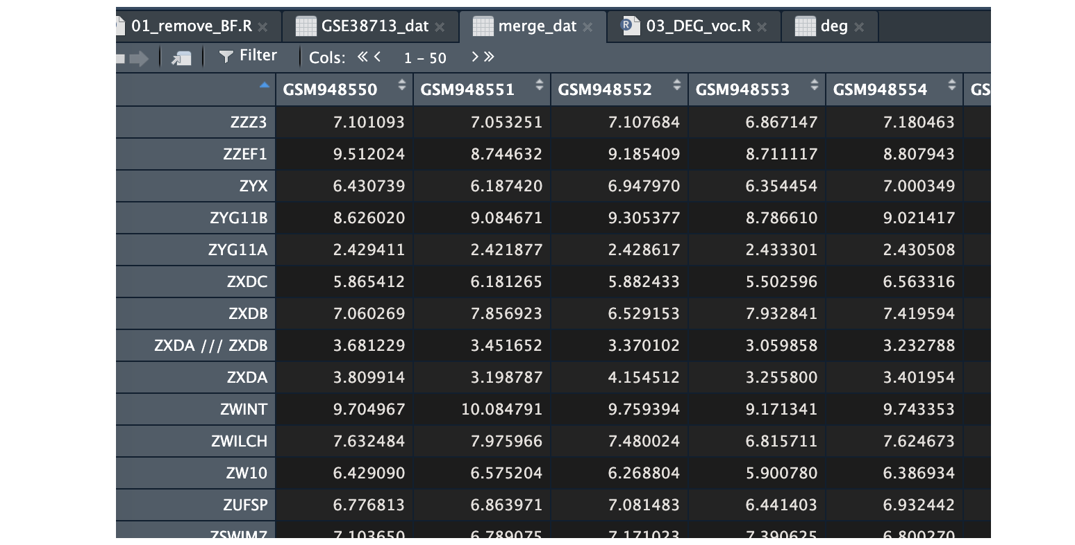 dat=dat[ids$probe_id,] #新的ids取出probe_id这一列,将dat按照取出的这一列中的每一行组成一个新的dat