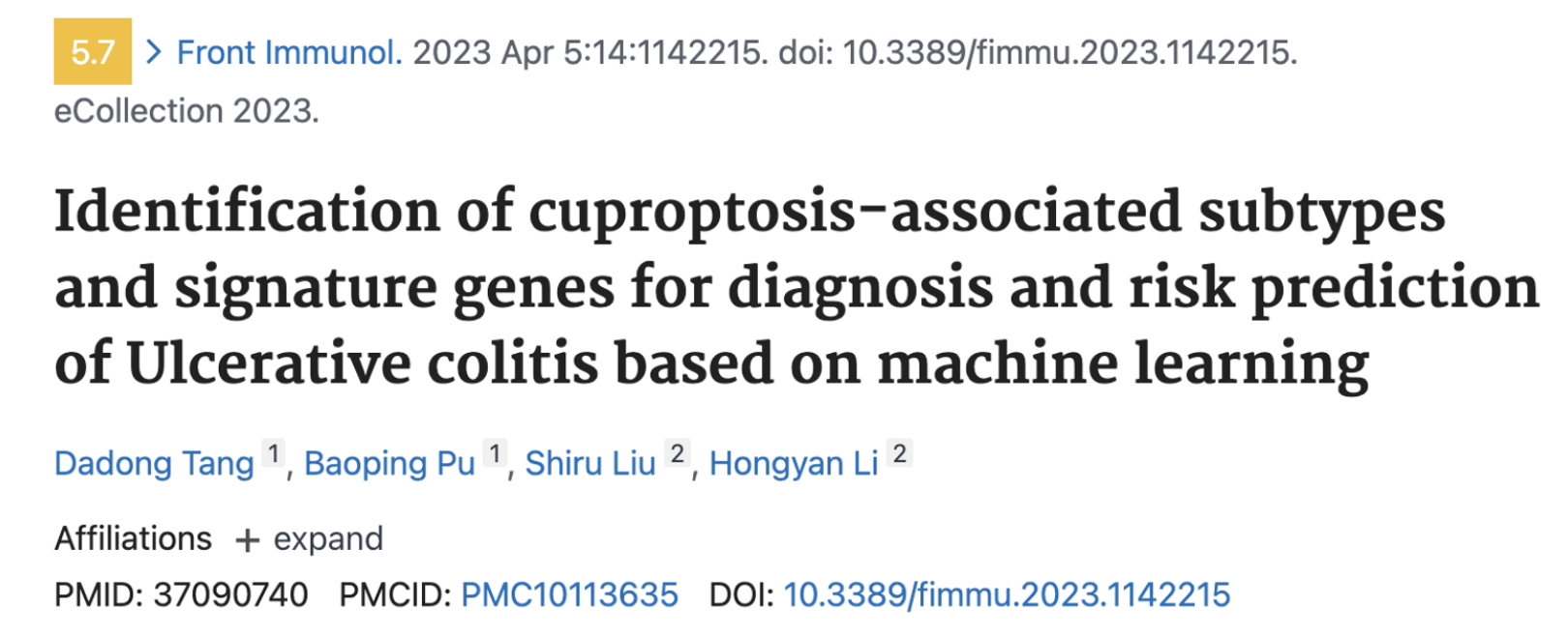 《Identification of cuproptosisassociated subtypes and signature genes for diagnosis and risk prediction of Ulcerative colitis based on machine learning》基于机器学习的溃疡性结肠炎诊断和风险预测中铜死亡相关亚型和特征基因的鉴定(IF:5.7) Date:2023.04