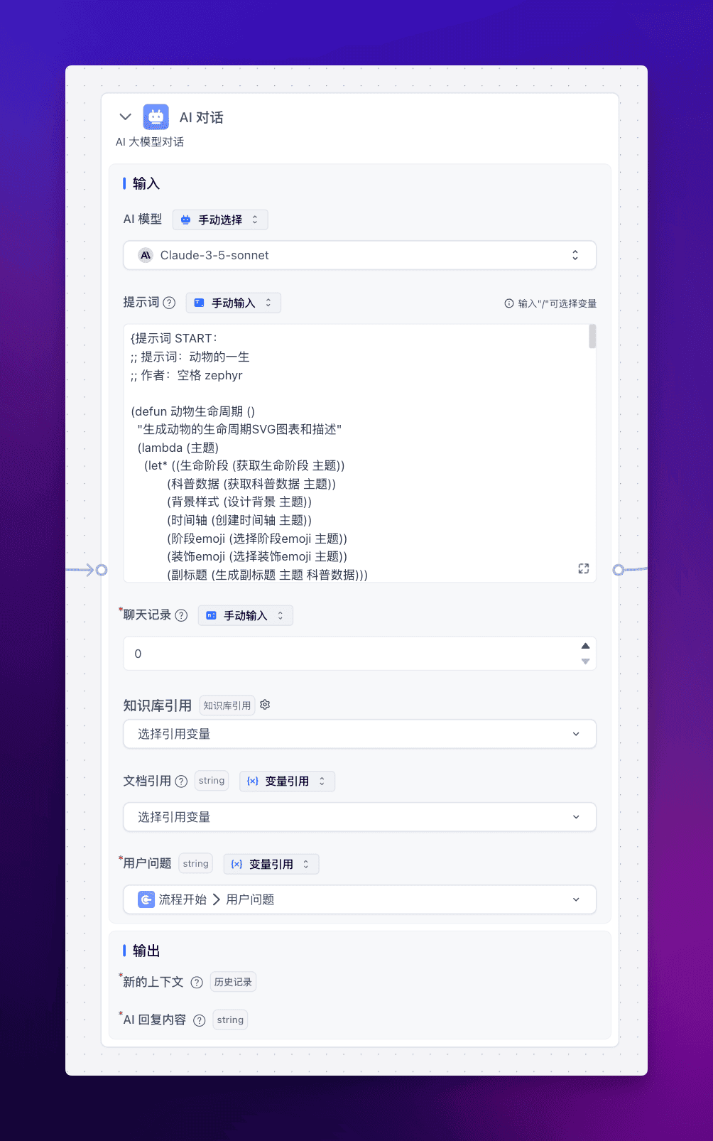 1️⃣ 首先接入 AI 对话节点,模型选择 Claude 3.5。