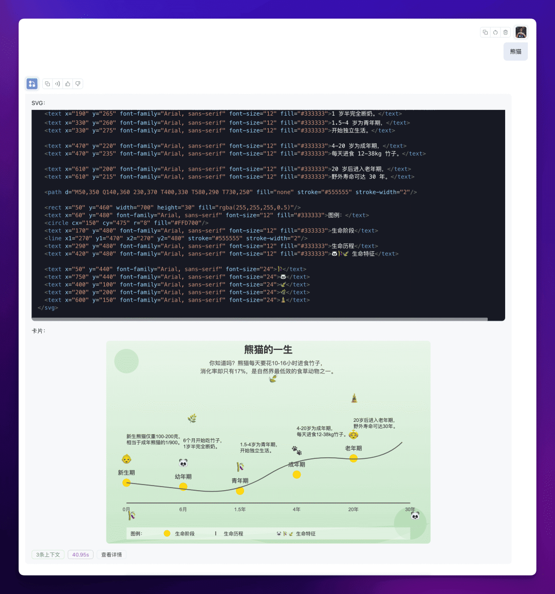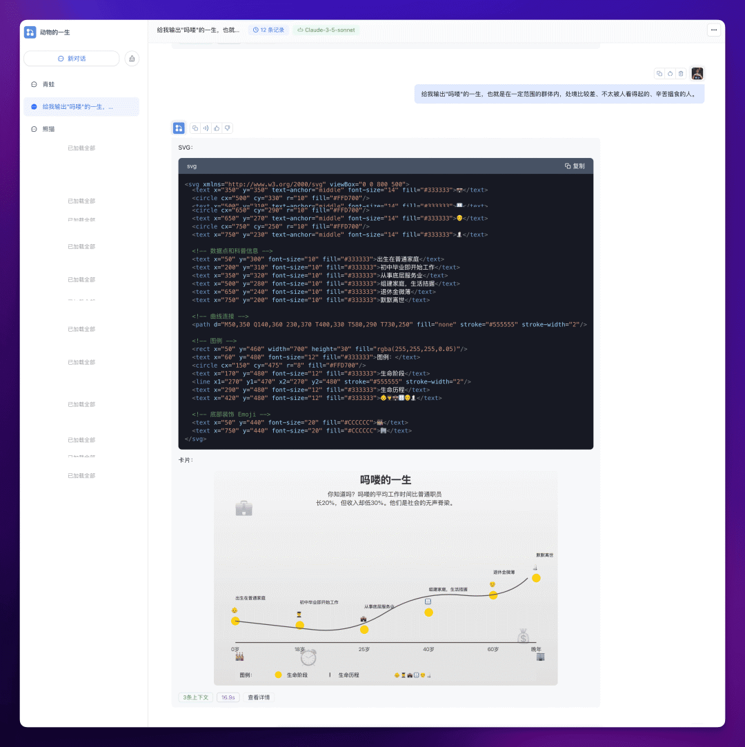 但光有提示词还不行,因为只有 Claude Artifact 才能直出 SVG 图片的预览,别的平台只能输出 SVG 代码,没办法直接预览图片。