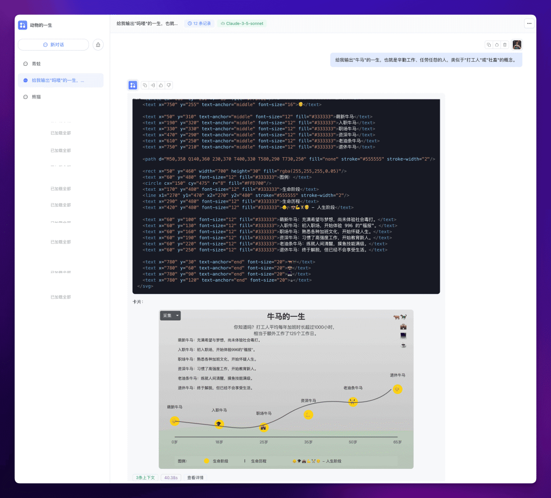 Claude 3.5 的理解能力果然很强,这个工作流虽然描绘的是动物的一生,但实际上我们可以让它生成任何事物的一生,比如 “牛马”,比如 “吗喽”,为了防止有些比较新的名词 Claude 不太理解,你可以稍微给它解释一下,最终它就会给你生成比较满意的一生来。