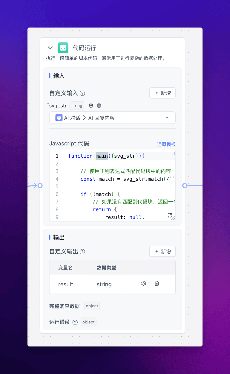 2️⃣ 接下来接到代码运行节点,这段代码的功能是将 svg 代码块中的内容提取出来,以便后续对其进行格式化输出。