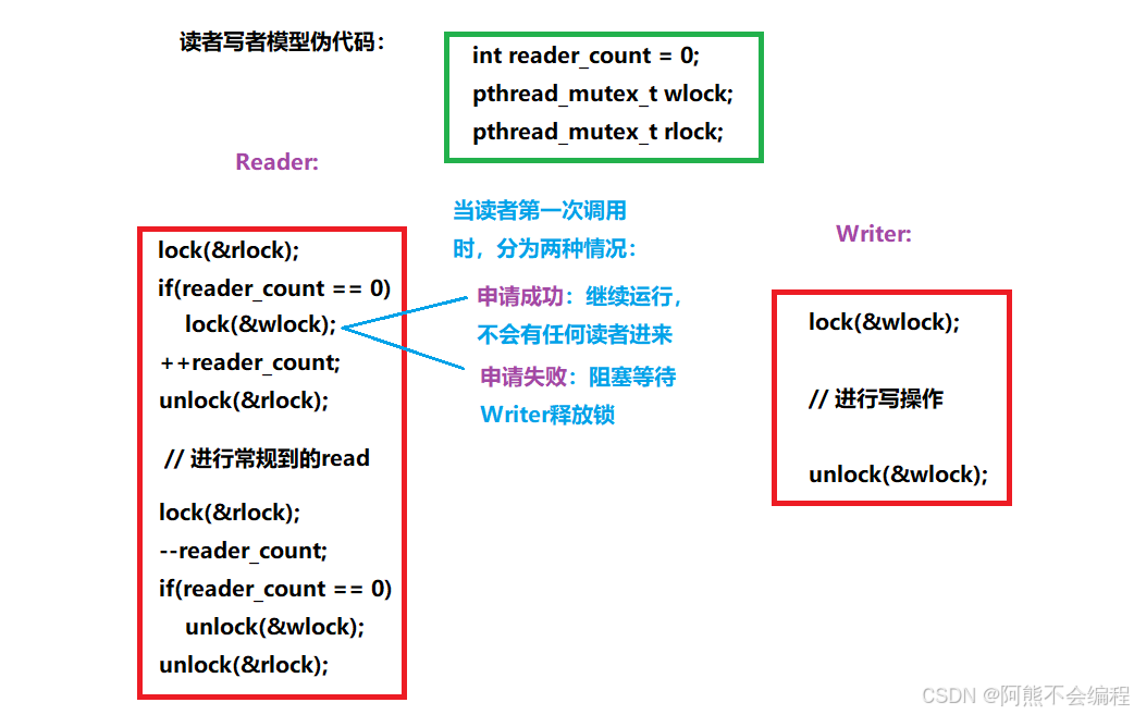 读取完成之后,需要将reader_count自减,把读者状态置为0,让其他读者线程可以进行申请锁,申请数据资源。而在正常的开发中,pthread线程库里给我们提供了 读写锁的接口: