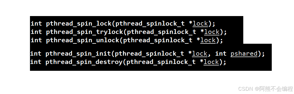 我们之前一直用的互斥锁都属于第一种情况的锁,而对于一些在临界资源访问时间比较短的线程来说,可以采用自旋锁来对线程进行加锁控制,而在Linux的pthread线程库当中,给我们提供了自旋锁的一些接口: