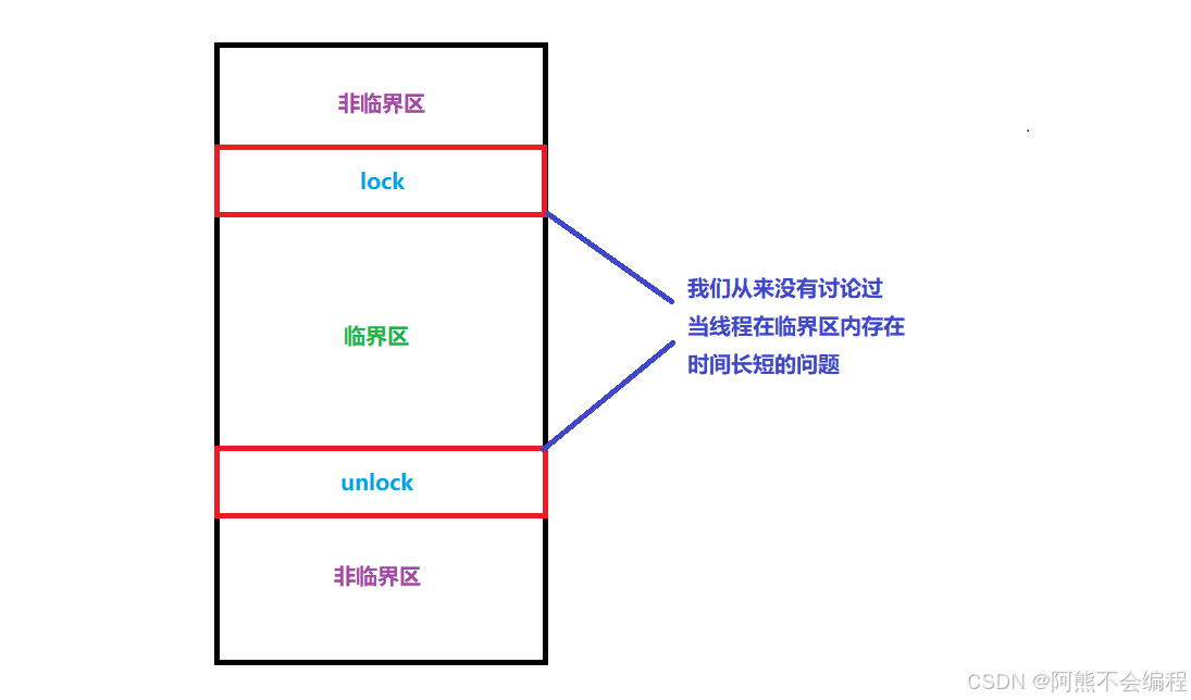 };我们从来没有讨论过线程在临界区内执行时间长短的问题:
