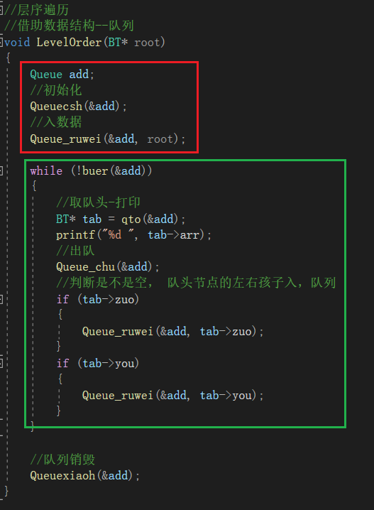 取队头节点,然后出队,判断这个节点是不是空,是空跳出循环。