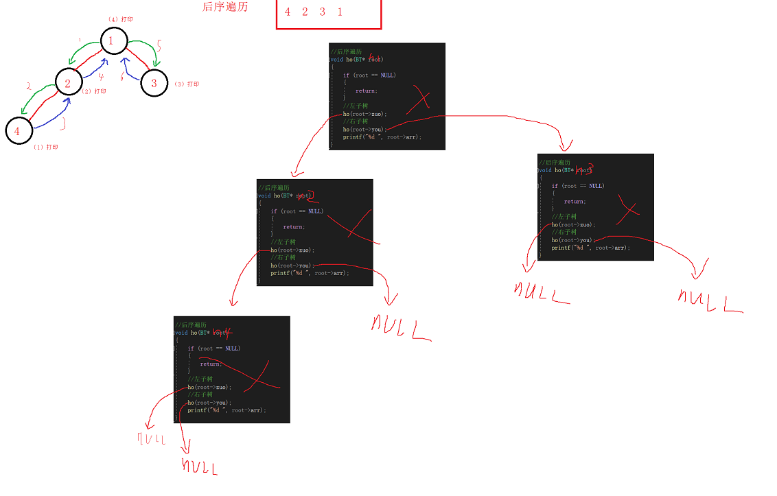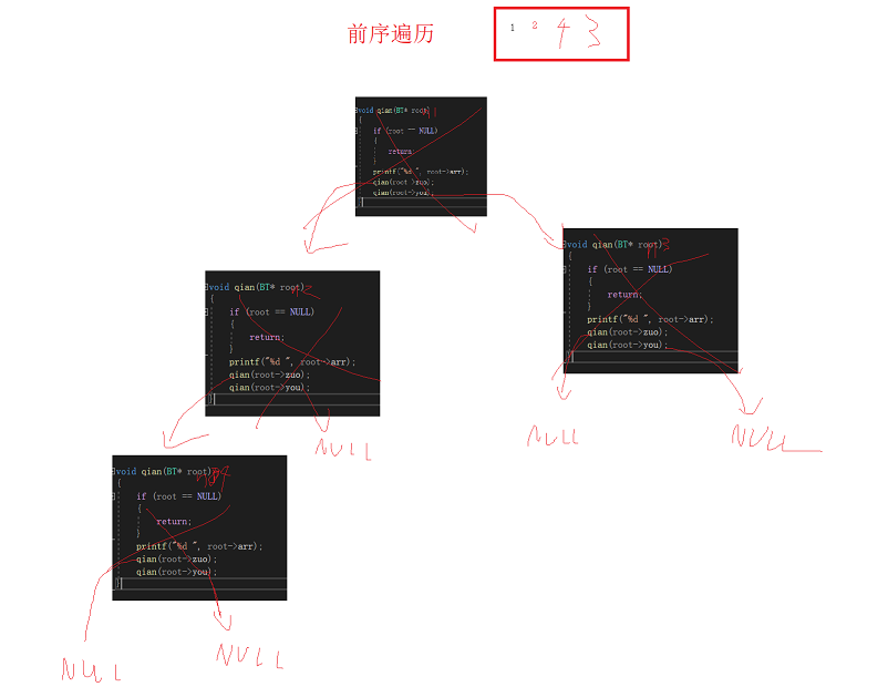 (1)前序遍历(PreorderTraversal亦称先序遍历):访问根结点的操作发⽣在遍历其左右⼦树之前 访问顺序为:根结点、左⼦树、右⼦树 (2)中序遍历(InorderTraversal):访问根结点的操作发⽣在遍历其左右⼦树之中(间) 访问顺序为:左⼦树、根结点、右⼦树 (3)后序遍历(PostorderTraversal):访问根结点的操作发⽣在遍历其左右⼦树之后 访问顺序为:左⼦树、右⼦树、根结点