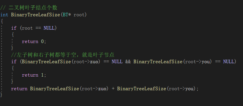 if (BinaryTreeLeafSize(root->zuo) == NULL && BinaryTreeLeafSize(root->you) == NULL)