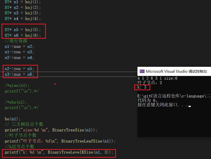 printf("k: %d \n", BinaryTreeLevelKSize(n1, 3));