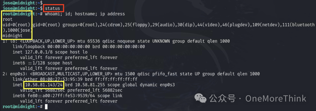 然后执行/usr/bin/status命令,正如前面所言,以root权限返回了一个shell