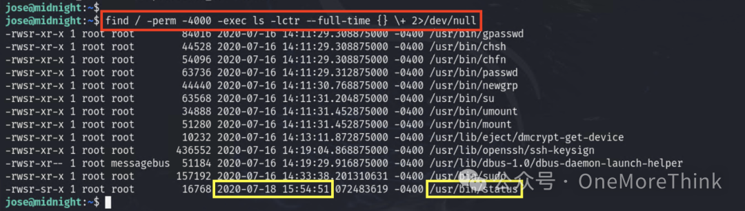 搜索服务器中有suid权限的程序,发现/usr/bin/status的变更时间最新,且不是系统自带命令