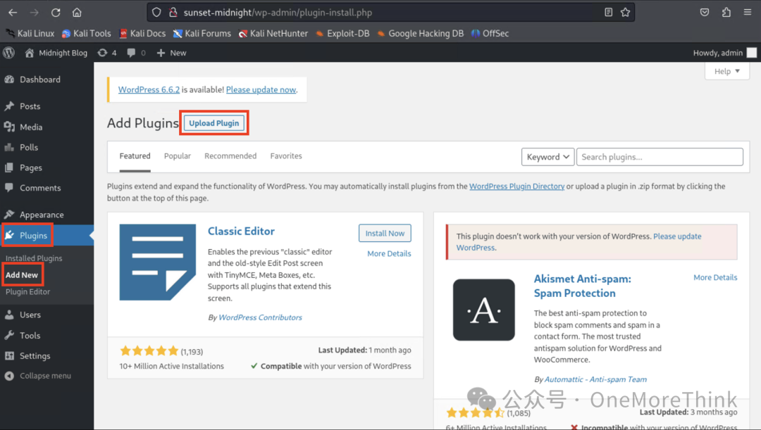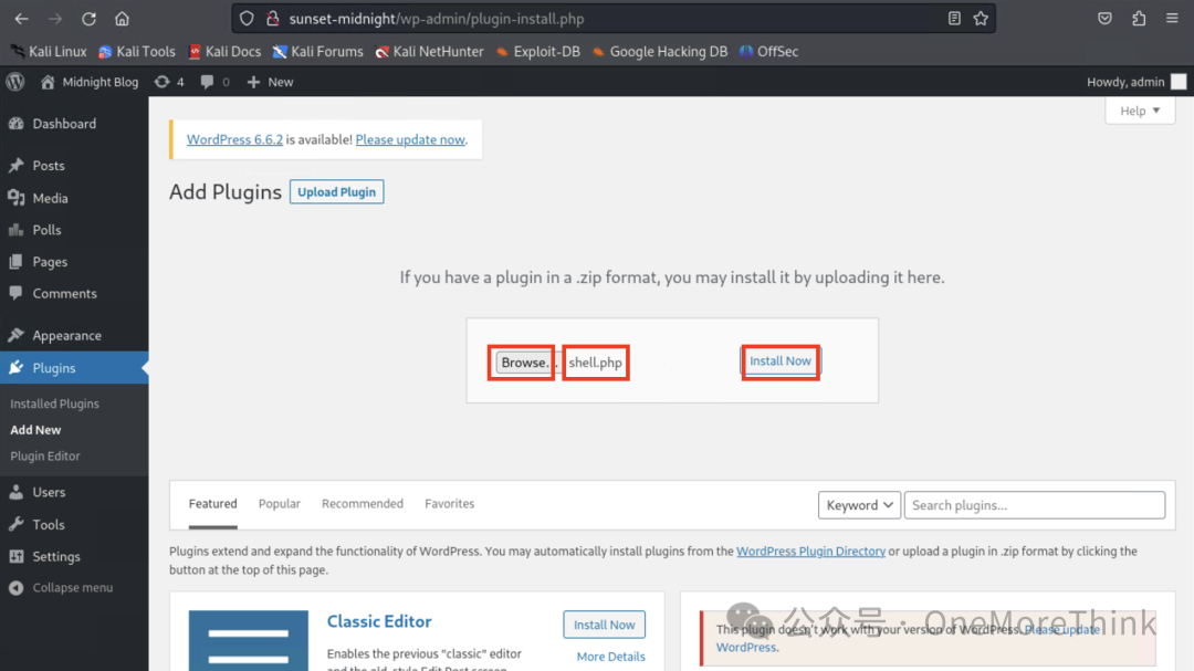 利用wordpress的上传插件功能,将反弹shell上传到服务器