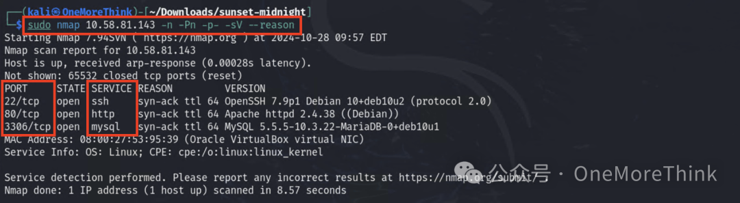 扫描端口和服务,发现22/ssh、80/http、3306/mysql