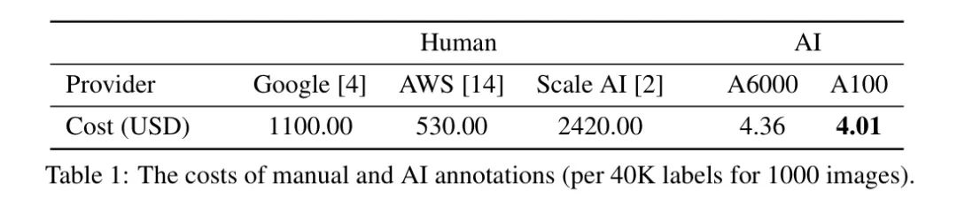手动标注的价格基于公开可用的报价,而AI标注的价格则估计为每个标签的平均推理时间以及从Lambda [8] 租用的GPU实例的价格。如表1所示,对于像CelebA数据集中的图像分类任务,AI标注的成本可以比人工标注的成本低至1%。