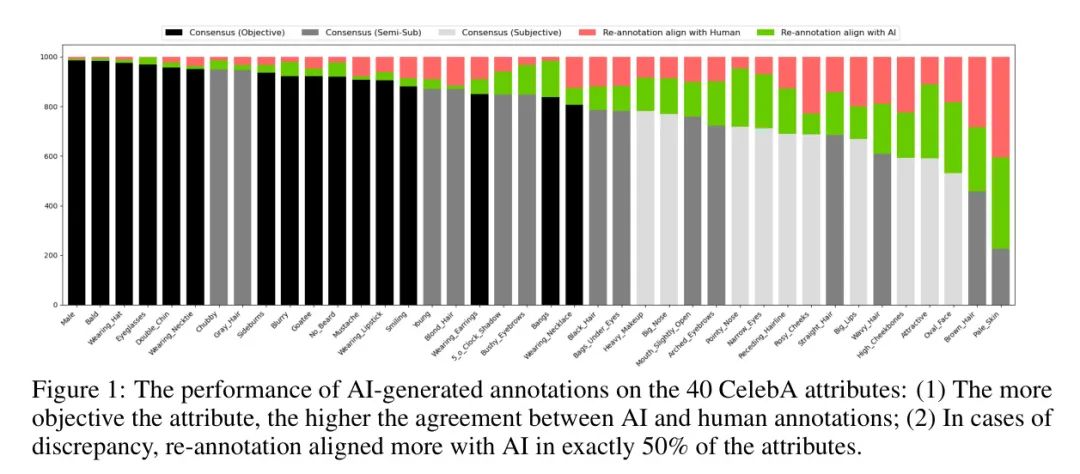 如图1所示,AI和原始人类标注达到了 79.5%的整体共识,在更客观的属性上数字更高。通过使用额外的重新标注进行多数投票,AI标注与最终共识之间的匹配率进一步提高到了89.1%。具体来说,重新标注显示了AI和人工标注的平等偏好,两种方法在20个属性中各有偏好。