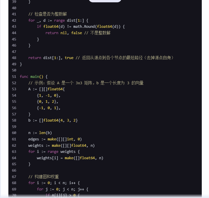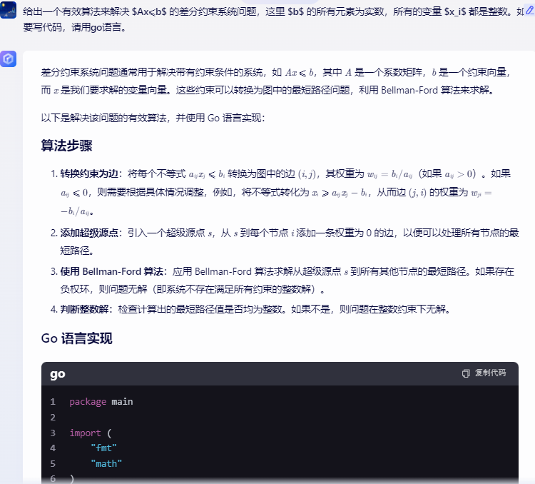 以下是用 Go 语言实现的解决 Ax \leq b 的差分约束系统的有效算法: