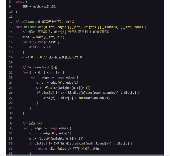 }u、终点v和边的权重cost。false。这个代码假设所有的变量都是非负整数,并且通过Bellman-Ford算法来求解差分约束系统问题。如果需要处理更复杂的约束条件,可能需要进一步调整和扩展代码。