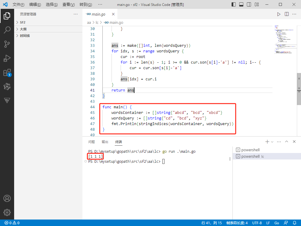 2024-10-26:最长公共后缀查询。用go语言,给定两个字符串数组 wordsContainer 和 wordsQuery,要对每个 wordsQuery[i] 找到一个与其有最长公共后缀的字符串。如果有多个字符串与 wordsQuery[i] 有相同的最长公共后缀,则返回在 wordsContainer 中最早出现的那个。最后,返回一个整数数组 ans,其中 ans[i] 表示与 wordsQuery[i] 有最长公共后缀的字符串在 wordsContainer 中的下标。