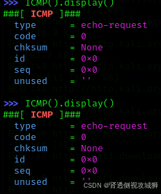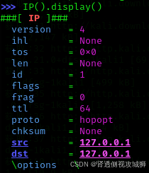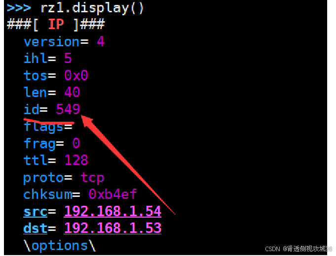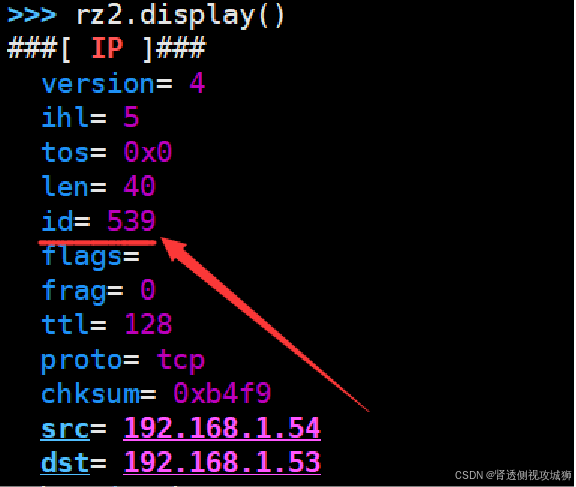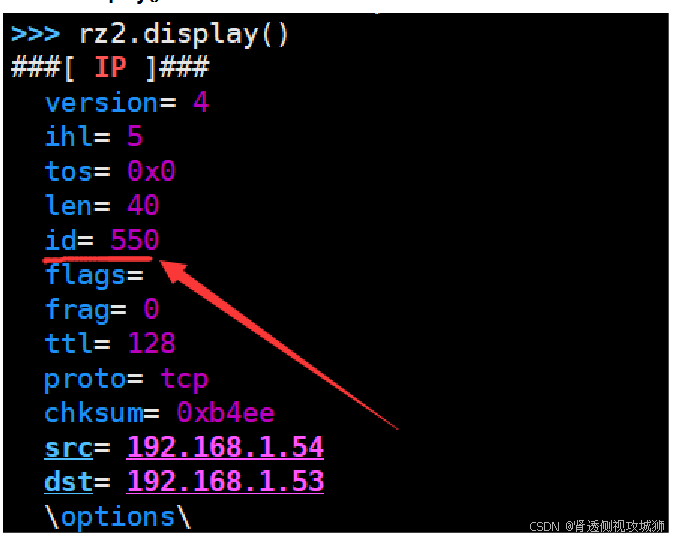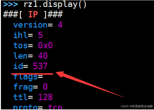 display()表示查看变量中的内容。我们只需要查看 IP 下面的 ID 字段即可rt=sr1(IP(src="192.168.1.54",dst="192.168.1.63")/TCP(dport=22),timeout=1)