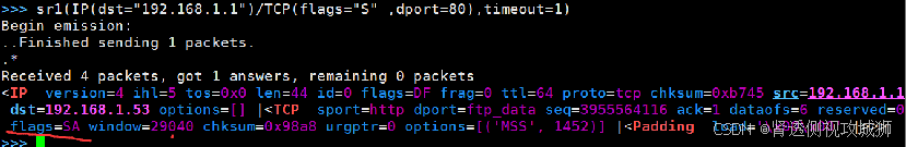 # TCP 数据包可以包含选项字段,此处没有设置选项。sr1(IP(dst="192.168.1.1")/TCP(flags="S" ,dport=80),timeout=1)