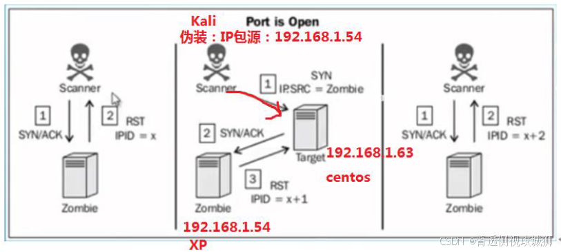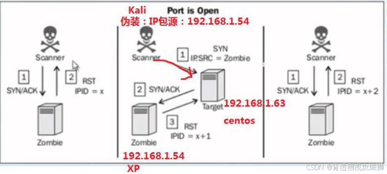 (1)、攻击者修改 IP 包头的 SRC 字段为僵尸主机的 IP,伪装成僵尸主机给目标主机发 SYN 请求。 (2)、目标主机收到请求,如果端口是开放的就会返回给僵尸主机一个 SYN/ACK 的数据包。 (3)、僵尸主机收到目标主机发来的 SYN/ACK 确认包,因为僵尸主机没有给你发 SYN 请求。所以僵尸主机给目标主机返回了一个 RST 数据包。这个数据包表示关闭连接。 此僵尸主机对外发出一个数据包,所以僵尸主机的 IPID 值+1。此时 IPID 值为 X+1。