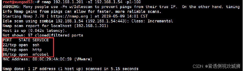 root@xuegod53:~# nmap 192.168.1.63 -sI 192.168.1.54 -p1-100