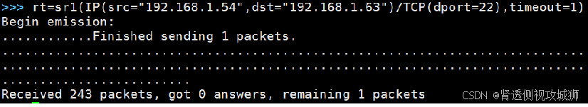 >>>rt=sr1(IP(src="192.168.1.54",dst="192.168.1.63")/TCP(dport=222),timeout=1)