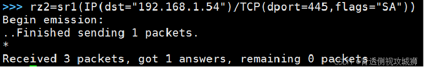 >>>rz2=sr1(IP(dst="192.168.1.54")/TCP(dport=445,flags="SA"))