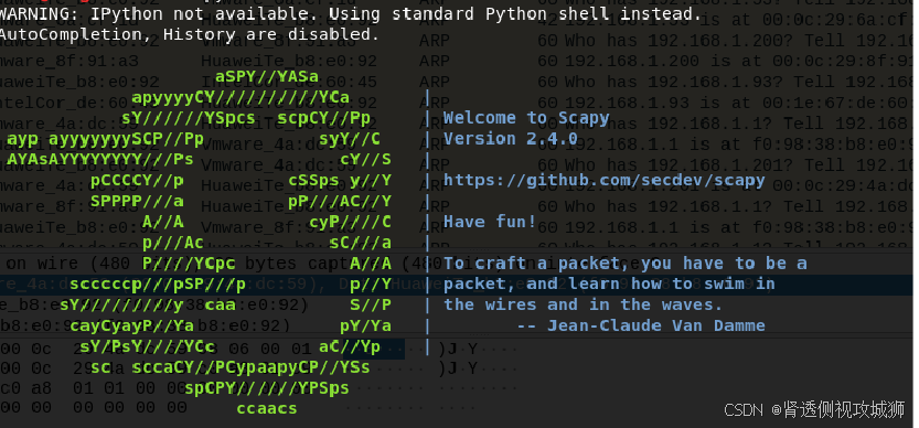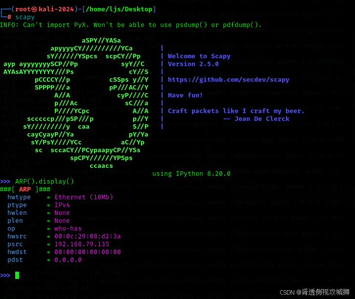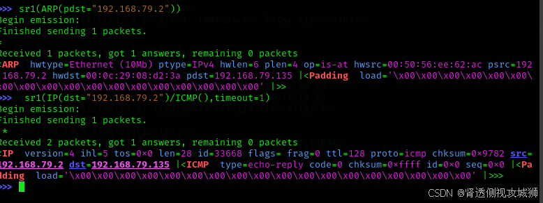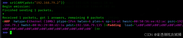 >>> exit() 发现源地址 psrc=192.168.79.2,说明已经收到网关的应答包。