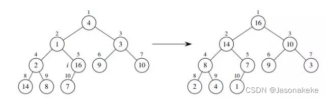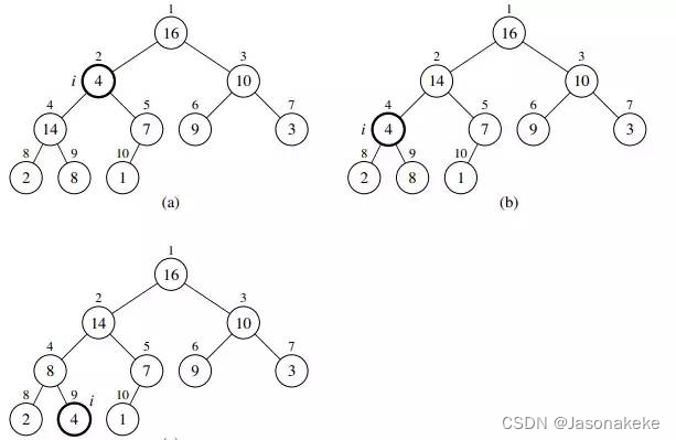 下图是一个运行 maxHeapify(heap, 2) 的例子。A[] = {16, 4, 10, 14, 7, 9, 3, 2, 8, 1},堆大小为 10。