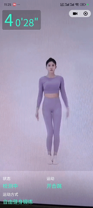 **计时模式:** 主要适应于动作保持的静态运动,如平板支撑、马步蹲、坐位体前屈等运动的识别计时,只会产生时长times(单位:秒),不产生数量counts(一直为0),且产生的时长为有效动作时长,即只有识别到用户一直保持符合动作则会产生计时,若用户中途动作走样或离开,则会停止计时,恢复动作后继续原来计时。
