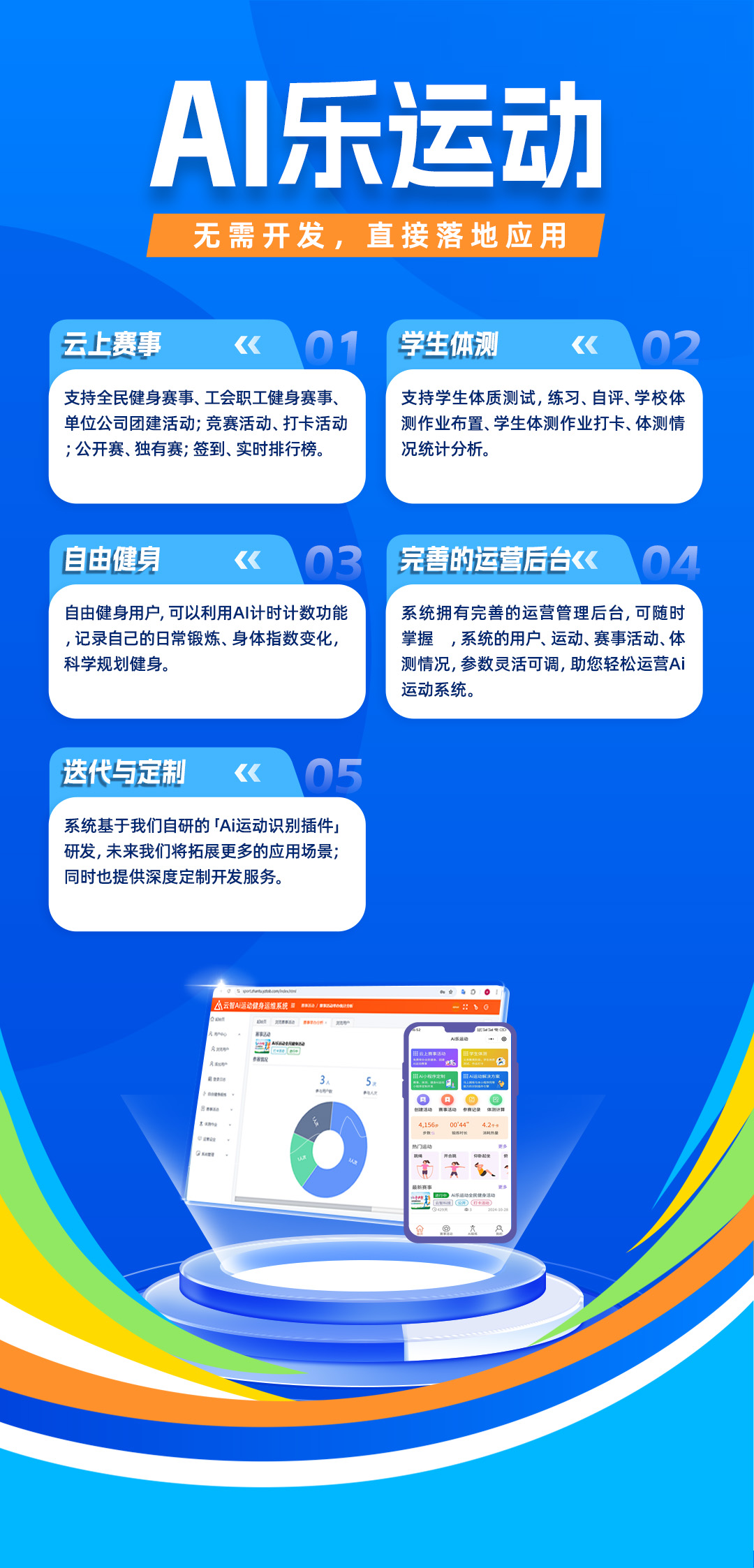 若您想开发**线上运动赛事、云上运动会、学生体测**相关的AI运动小程序,但又无开发能力或不想投入开发资源进行自研。针对此类用户我们提供了可直接落地的解决方案「Ai乐运动」,可在直接搜索登录小程序进行赛事举办,学生体测作业布置,系统支持多种赛事模式、体测作业布置、提交、测验,拥有完着的后台管理系统,支持SaaS和私有部署方式,可定制开发。无需开发,直接快速落地应用。