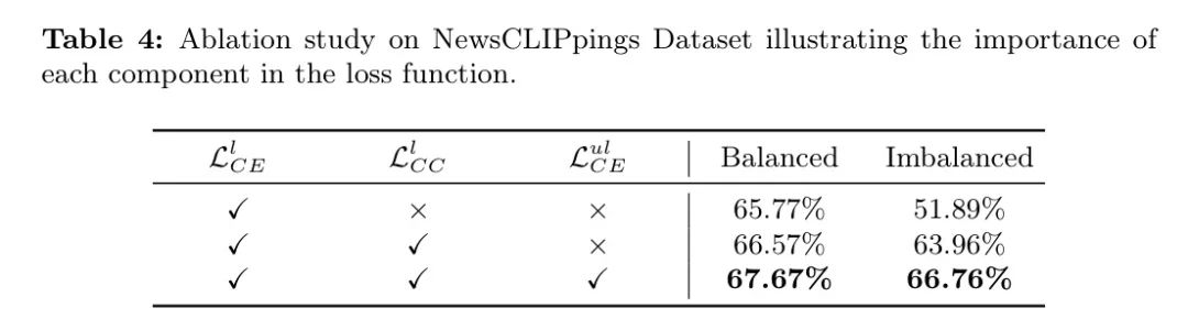 提出的框架使用三个损失组成部分进行训练。为了证明每个建议组成部分的重要性,作者在新闻CLIPpings数据集上进行了消融研究。表4展示了平衡和不平衡情况下的结果。第一行表示仅使用 Token 交叉熵损失()训练的模型,实际上是在没有额外指导的情况下微调CLIP。添加对比聚类损失()显著提高了性能,通过强制实现真实和假样本对之间的更好分离。最后,将 未标注 数据损失()与从CLIP和BLIP共识生成的强健伪标签相结合,进一步提高了性能,展示了CoVLM在半监督MFND方面的优势。