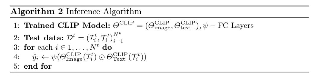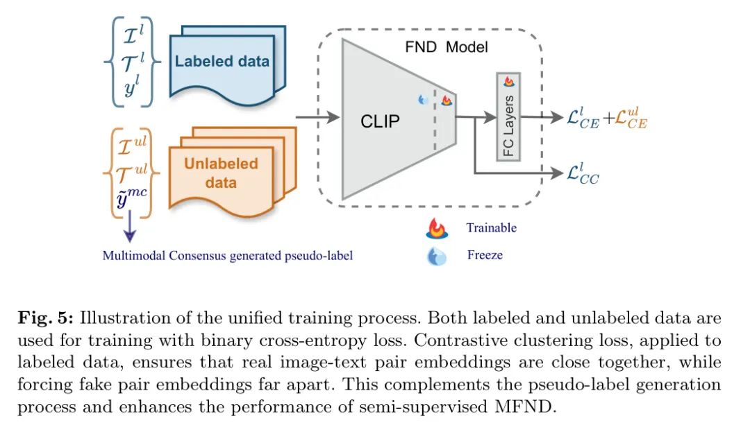 现在,作者描述了利用 Token 和 未标注 输入的提出的半监督MFND框架的完整训练过程。在训练期间,CLIP图像编码器的最后几层以及两个全连接层被学习。对于图像-文本对,预测输出为,其中表示哈达马乘法(逐元素乘法)。