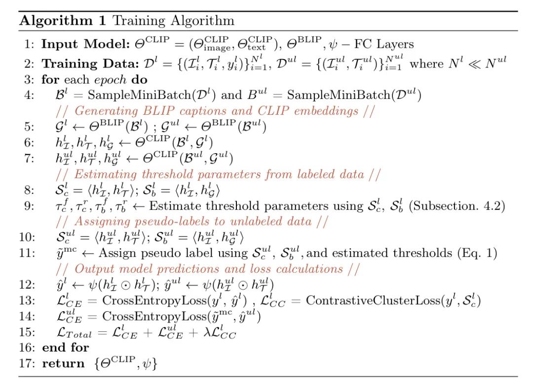 对于真实的图像文本对,它们在CLIP共享潜在空间中的对应嵌入将相对较近,这通过CLIP共识得分来衡量,其中表示两个向量的内积,衡量它们之间的相似性。类似地,BLIP共识得分,该得分通过BLIP生成的文本嵌入和原始文本的嵌入计算,,对于真实对较高,对于假对较低。因此,对于真实的图像文本对,两个得分都较高,而对于假对,两个得分都较低,因为图像和文本会不同意,此外,原始和生成的文本也会相差很远。这种模型共识确保了为未标注数据生成稳健的伪标签。在模型不同意的情况下,不使用这些未标注样本进行训练。