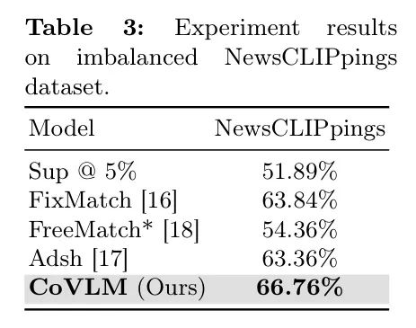 作者在诸如NewsCLIPpings,GossipCop和PolitiFact等基准数据集上的广泛实验证明了CoVLM的有效性。此外,CoVLM有效地处理了数据不平衡问题,在数据集不平衡时仍然保持了其性能,以反映真实世界的情况。