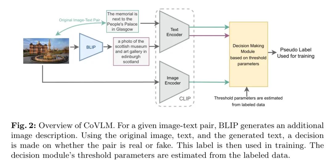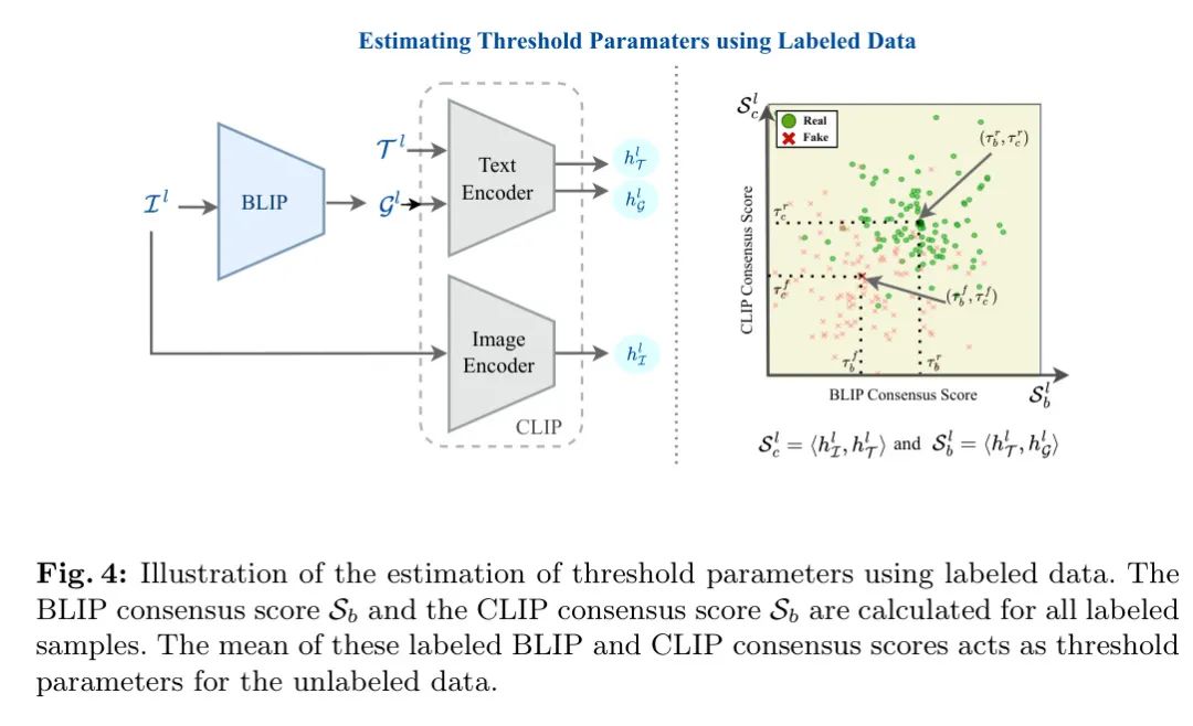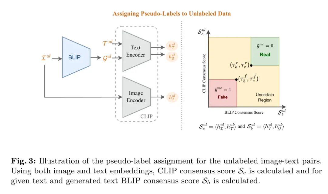 在这篇论文中,作者将解释如何为训练集中的未标注数据确定稳健的伪标签。仅使用CLIP模型来生成真/假伪标签具有挑战性,因为真实的假图像文本对在语义上非常接近,很难区分它们与实际真实对。为了解决这个问题,作者提出了一种共识机制,该机制基于两种视觉语言模型(VLMs)CLIP和BLIP。