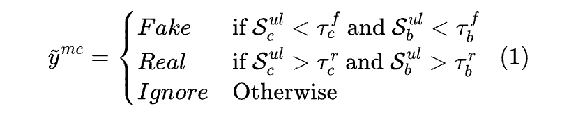 正如之前所提到的,作者使用模型共识为 未标注 的数据生成伪标签,其中满足方程1中标准的自信伪标签被用于训练模型,具体如下: