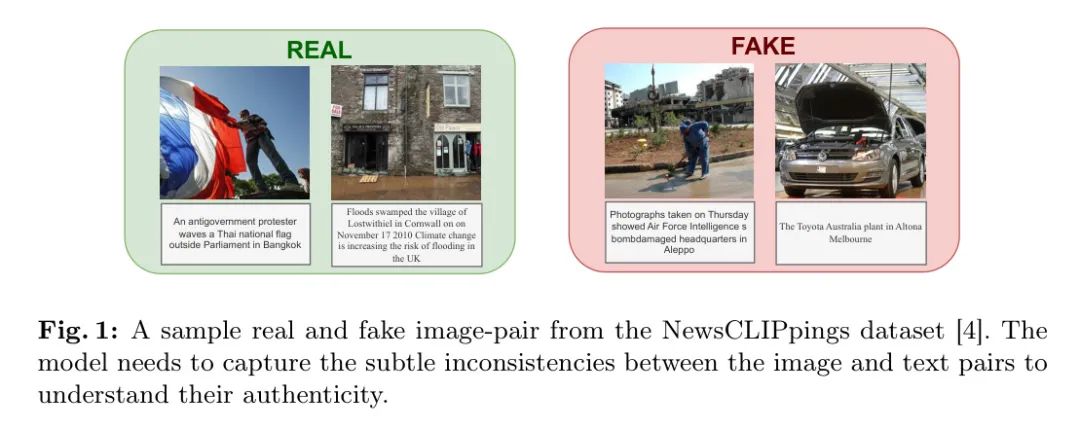 社交媒体上的假新闻蔓延使得假新闻检测成为保持信息完整性的关键任务,保护公共言论,并防止信任侵蚀[1]。生成假新闻的越来越受欢迎的方法是将真实图像与误导/不正确的标题配对,因为这样需要最小的努力和技术专业知识。图1展示了来自基准新闻CLIPings数据集[4]的真实和假图像-文本配对的一些例子。假新闻通常在视觉内容和伴随文本之间存在差异,而真实新闻则往往在图像和文本之间具有连贯的关系。