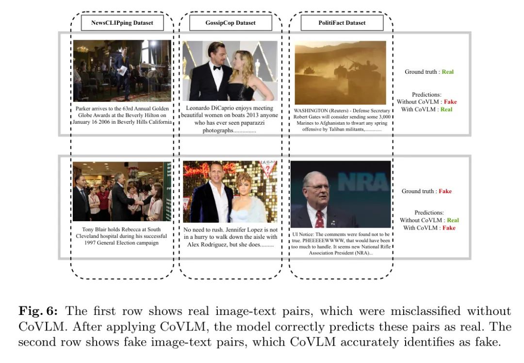 图6展示了CoVLM方法在三个不同的数据集(新闻CLIPpings、GossipCop和PolitiFact)上识别真实和虚假新闻的有效性。在第一行,这些图像-文本对来自真实类别,但在没有CoVLM的情况下被错误地预测为虚假新闻;在有CoVLM的情况下,它们被正确地预测为真实新闻。相比之下,在第二行,这些没有CoVLM的情况下被错误地分类为真实故事但被正确识别为虚假新闻的实例。