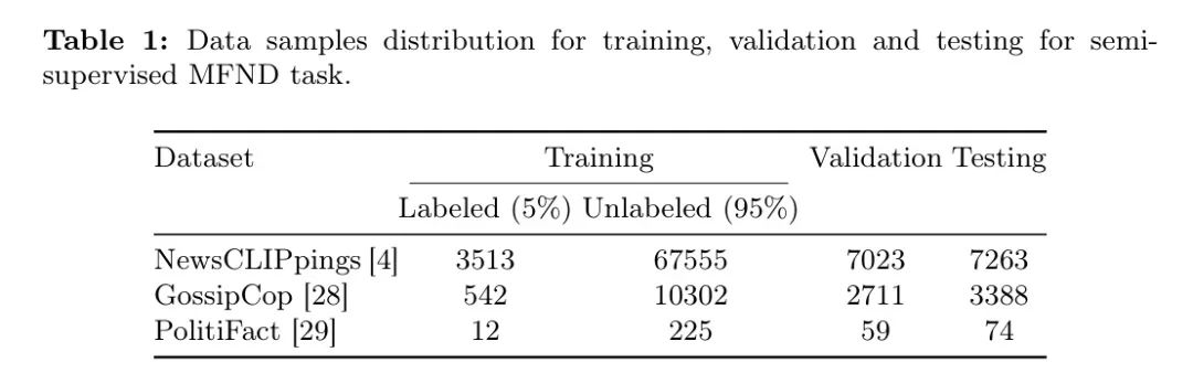 表1展示了每个数据集在半监督MFND任务中的训练、验证和测试阶段的样本详细划分。
