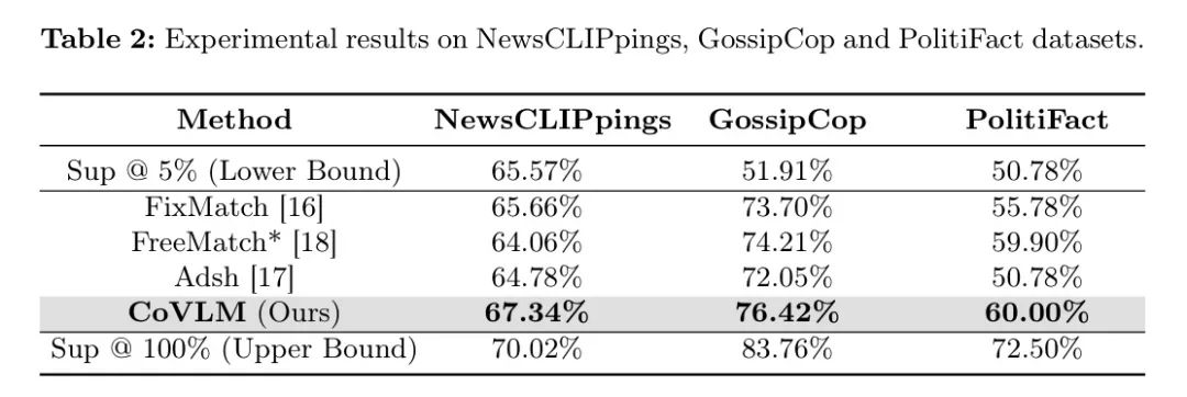对于 GossipCop数据集,仅使用5%的 Token 数据时, Baseline 准确率为51.91%。然而,提出的CoVLM显著提高了这一性能,实现了76.42%。在PolitiFact数据集上, Baseline 有监督准确率为50.78%。在这里,CoVLM展示了显著的改进,实现了60.00%。尽管在这些数据集中仍有改进的空间以达到上限,但CoVLM在显著程度上超过了最先进的半监督方法。