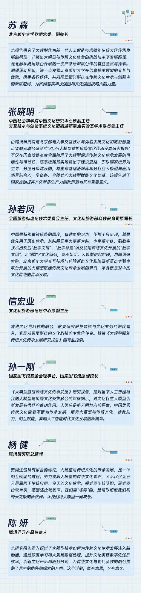 近期由腾讯研究院与北京邮电大学交互技术与体验系统文化和旅游部重点实验室联合举办“大模型赋能传统文化传承发展研究报告发布暨专家研讨会”,会上由北京邮电大学副校长苏森,腾讯研究院总顾问杨健联合发布报告成果,文化和旅游部科技教育司以及腾讯研究院、中国社会科学院、国家图书馆基金会、文化和旅游部信息中心、北京大学、北京邮电大学等来自文化与科技领域的专家学者进行了主题分享和深入交流研讨。