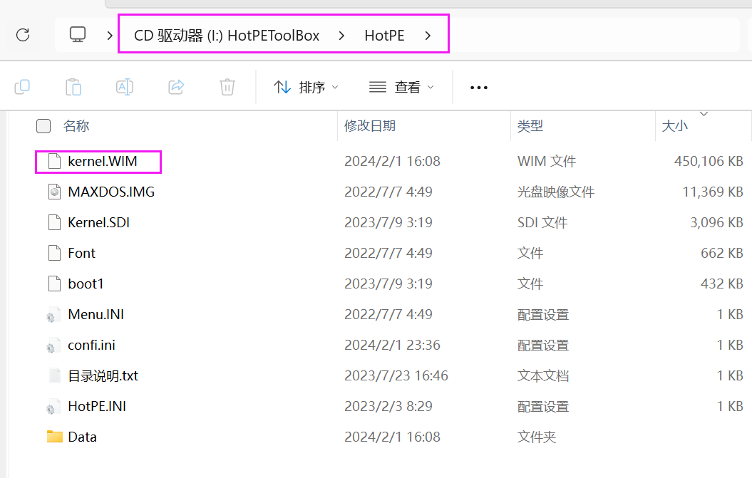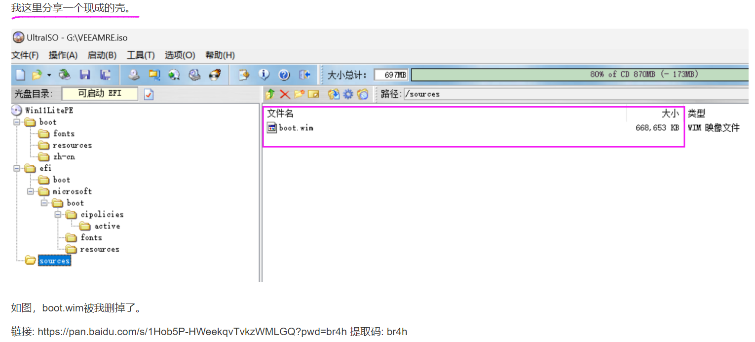 6、下载一个现成的Win11PE的ISO壳子,用上步生成的boot.wim替换到下图sources目录位置然后另存为一个新的ISO,或者用HotPE ISO的壳,用boot.wim替换到原来kernel.WIM的位置并重命名为kernel.WIM,然后另存为一个新的ISO。